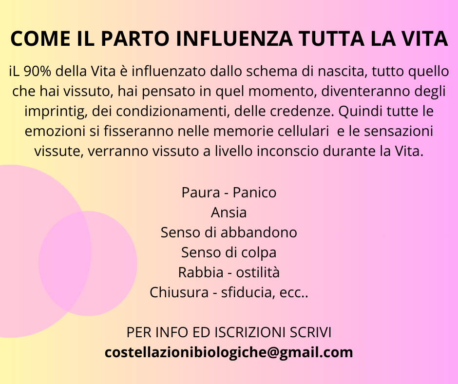 Come conduttrice di Costellazioni Familiari e Rebinther ho potuto verificare molte volte quanto lo schema di nascita sia l’origine di molti disturbi, situazioni, emozioni debilitanti.
